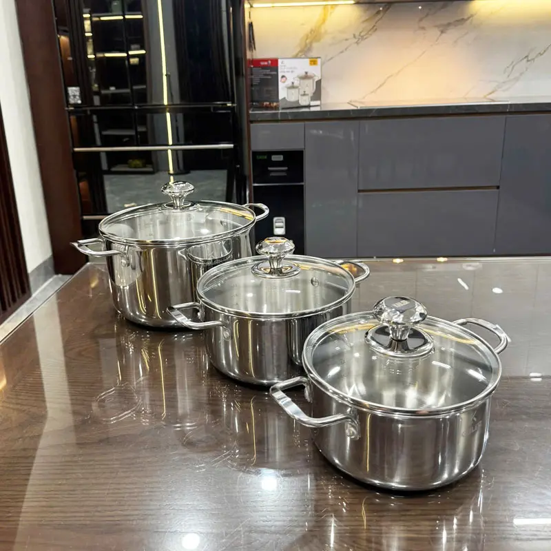- Gồm: 3 nồi kèm vung với kích thước khác nhau.