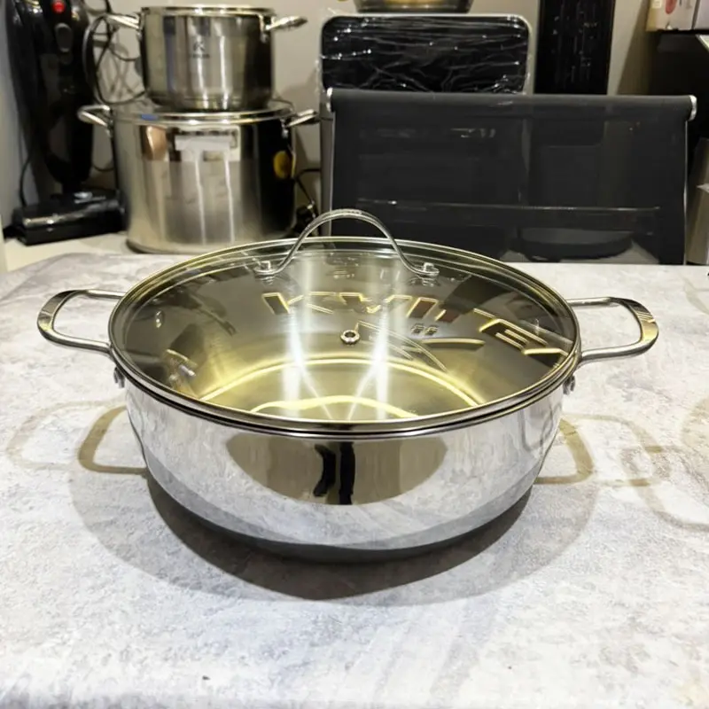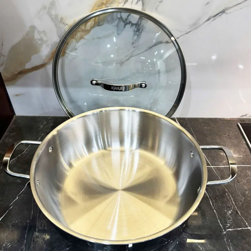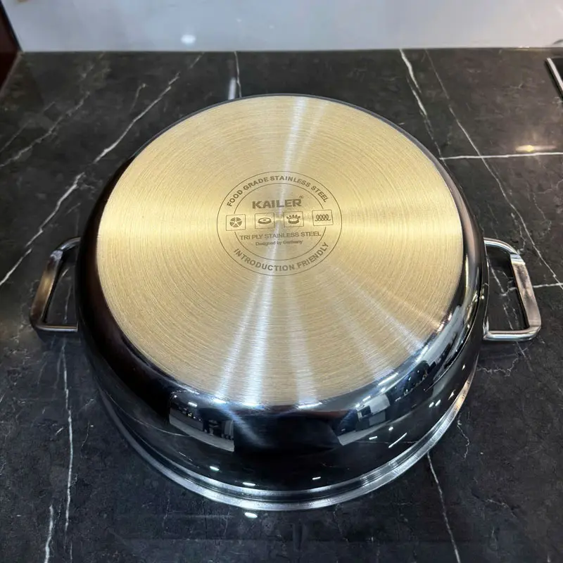 Nồi inox đa năng Kailer KL-3028 có kích thước 28cm, được thiết kế liền khối 3 lớp với độ dày 2.3mm, đảm bảo độ bền vượt trội và khả năng truyền nhiệt tối ưu.